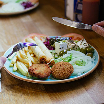 Pan, puré de garbanzos, lechuga, tomate, col, cebolla y salsas acompañado de arroz o patatas.